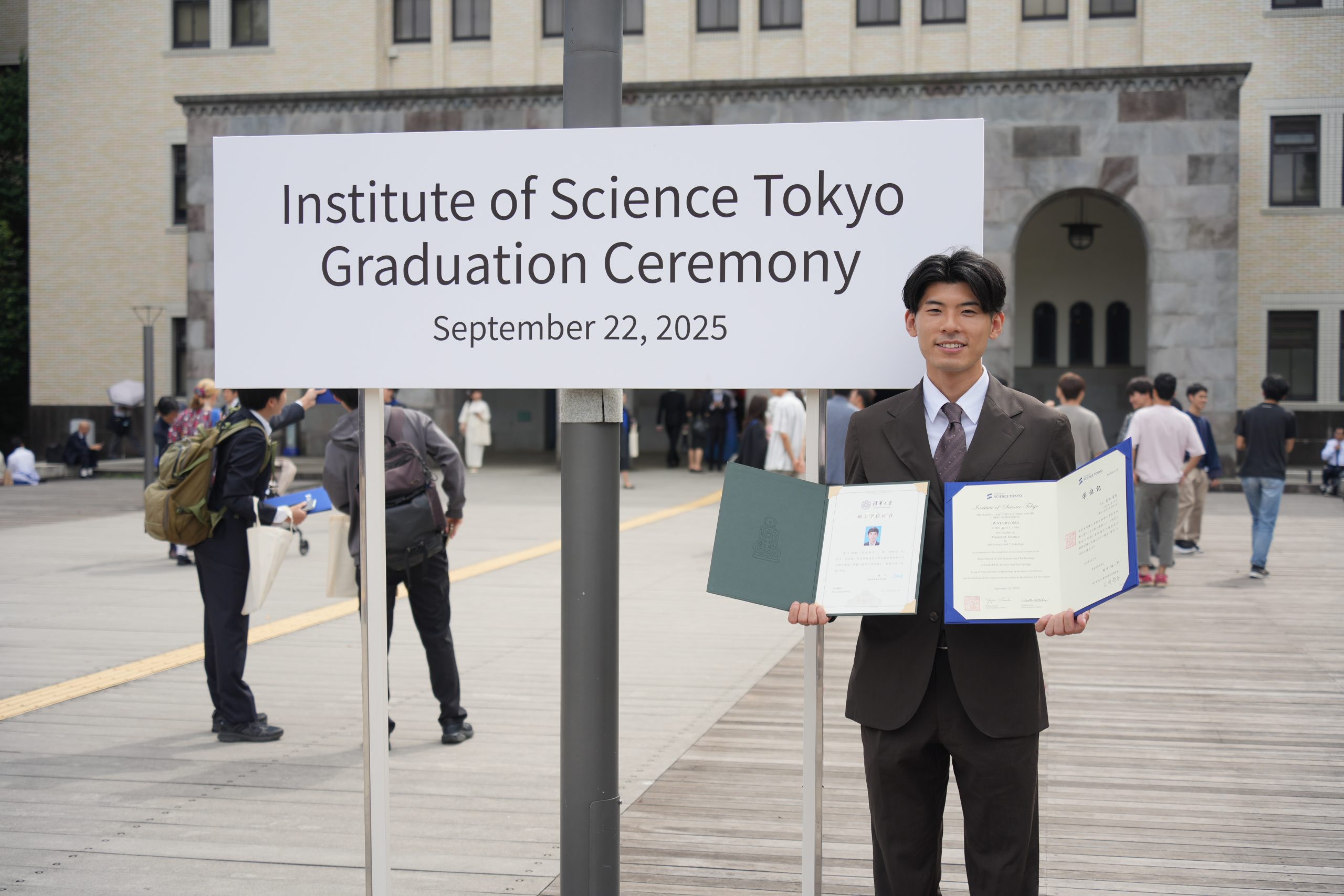 大学院進学にあたり「海外で研究したい」という思いが強く、幼少期を過ごした経験から、中国を「原点に立ち返る場所」として選びました。清華大学の魅力は、潤沢な研究資金と学生の活気です。私の所属研究室は応用研究が中心で、産学連携が非常に盛んなため、成果が出るとすぐに工場でのパイロット試験が行われ、実用化に直結するスピード感がありました。国から重点研究への支援があり、シーケンス解析といった実験でも「コストよりも速度」が最優先されていたのが印象的です。日本の研究の「精密さ」と、中国の「スピード感」の良い部分を同時に吸収できる、貴重な経験でした。また、広大なキャンパス内には寮、食堂、床屋、スポーツ施設などが揃っており、学業と生活が密接につながっています。そのため、学生同士が自然と交流する機会が増え、共に学び、共に生活する仲間意識が育まれる環境でした。 写真: 東京科学大学 学位記授与式 2025.9.22